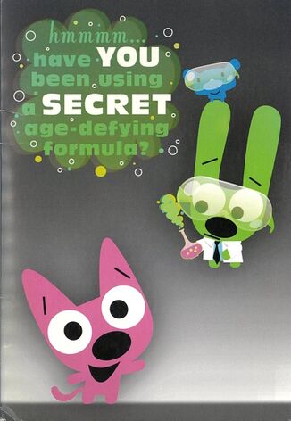 Front: "hmmm... have YOU been using a SECRET age-defying formula?" written by a green cloud, with Piddles wearing safety goggles, Yoyo wearing a science outfit, and Hoops standing at the bottom.