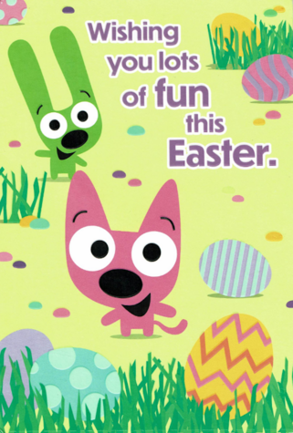 Front: "Wishing you lots of fun this Easter." with Hoops and Yoyo standing near jellybeans and eggs.