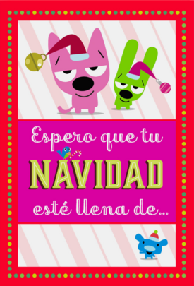 Inside: "No, no, no… llena de AMOR, de mucha ALEGRÍA y de infinita PAZ. Feliz Navidad (No, no, no… filled with LOVE, lots of JOY, and plenty of PEACE. Merry Christmas)" with Hoops and Yoyo both jumping with 2 trees in the background.