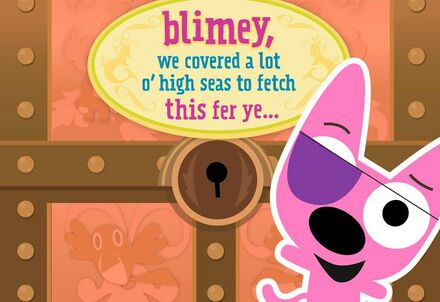 Front: "blimey, we covered a lot o' high seas to fetch this fer ye..." With Hoops wearing an eye patch while standing in front of a chest that has Bluebird and Chilli Bear on it.