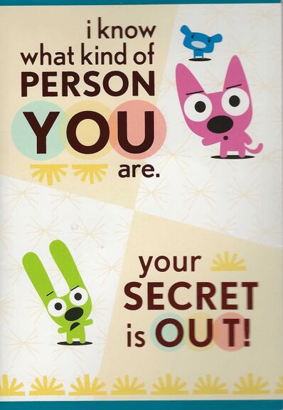 Front: "i know what kind of PERSON YOU are. your SECRET is OUT!" with Piddles, Hoops, and Yoyo in a light-pastel yellow pattern.