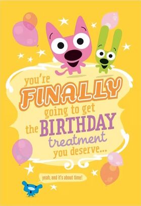 Front: "you're FINALLY going to get the BIRTHDAY treatment you deserve..." with Hoops, Yoyo, and Piddles standing in front of stars and balloons, with Piddles saying "yeah, and it's about time!"