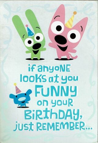 Front: "IF ANYONE LOOKS AT YOU FUNNY ON YOUR BIRTHDAY, JUST REMEMBER..." with Yoyo, Hoops, and Piddles wearing party hats,