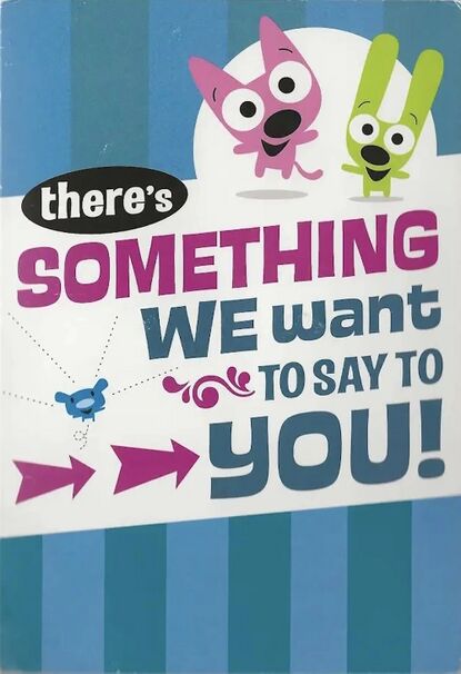 Front: "there's SOMETHING WE WANT TO SAY TO YOU!" with Hoops and Yoyo on the top, and Piddles at the bottom with two arrows below her.