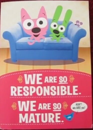 Front: "WE ARE SO RESPONSIBLE. WE ARE SO MATURE" with Hoops, Yoyo, and Puck on a blue coach, with Piddles at the bottom saying "HUH?? who ARE you?"