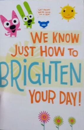 Front: "WE KNOW JUST HOW TO BRIGHTEN YOUR DAY!" with Hoops, Yoyo, and Piddles in a white background with the Sun at the top, and flowers at the bottom. Yoyo says "GET READY, WE'RE GOIN ON A TRIP!"