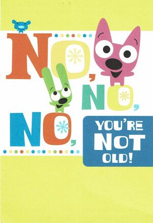 Front: "NO, NO, NO, YOU'RE NOT OLD!" with Piddles, Hoops, and Yoyo.