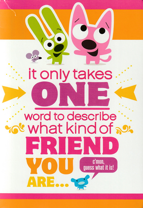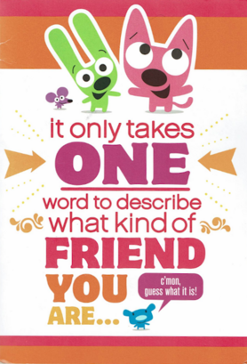 Front: "it only takes ONE word to describe what kind of FRIEND YOU ARE..." with Puck, Yoyo, and Hoops. with Piddles below saying "c'mon, guess what it is!"